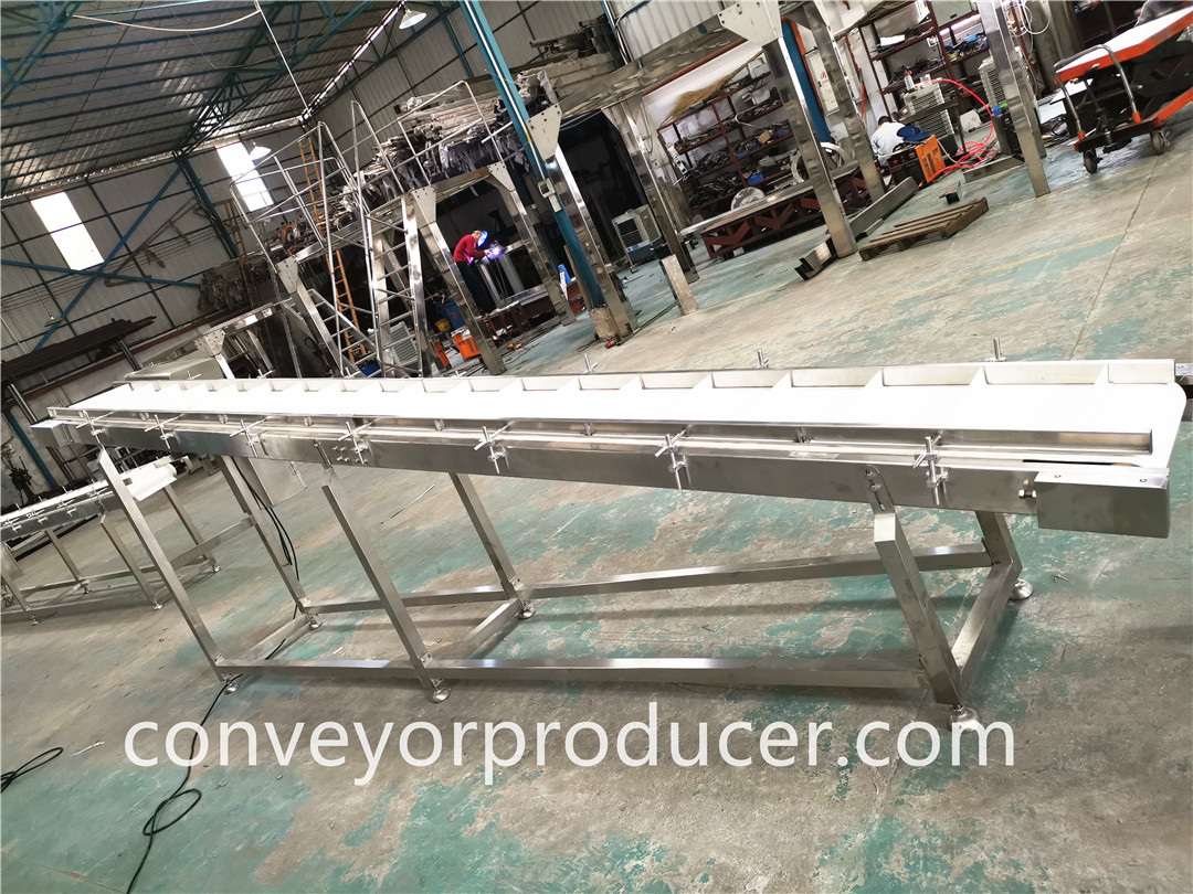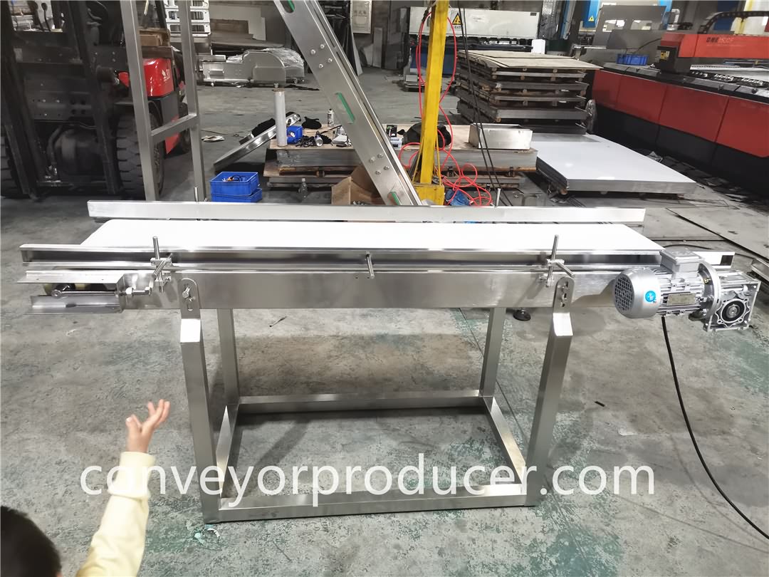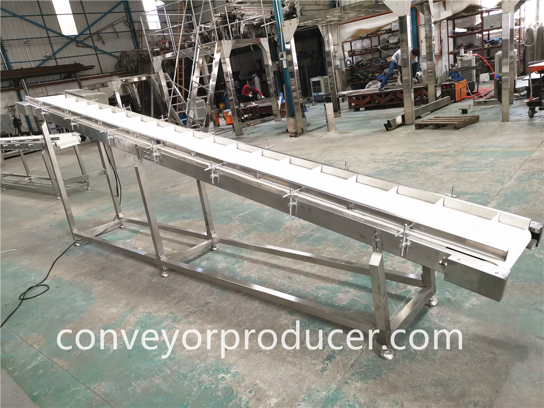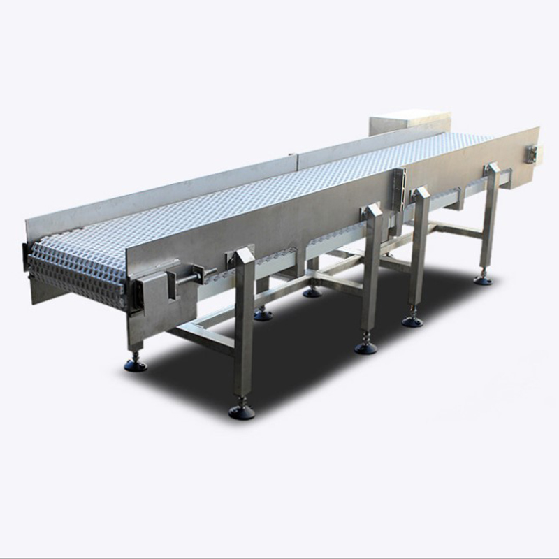 Add organic block material in the middle of the chain board, Two side: 304 or PP to fix or block the material. The chain board rotates and feeds the sidewall without rotating the chain plate to work.Mainly suitable for conveying materials, with outer packaging, small bags of items, bulky bulk, block, packed carton.