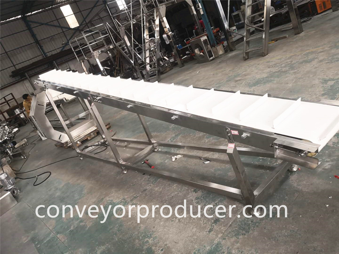 A middle pair to the belt, Two side: 304 or PP to fix or block the material. Belt rotation to send material while the baffle is fixed. It is mainly suitable for conveying the material with outer packaging, massive or granular article, such as candy. sausage, fruit, vegetable, medicine, carton, etc, from low to desired location.