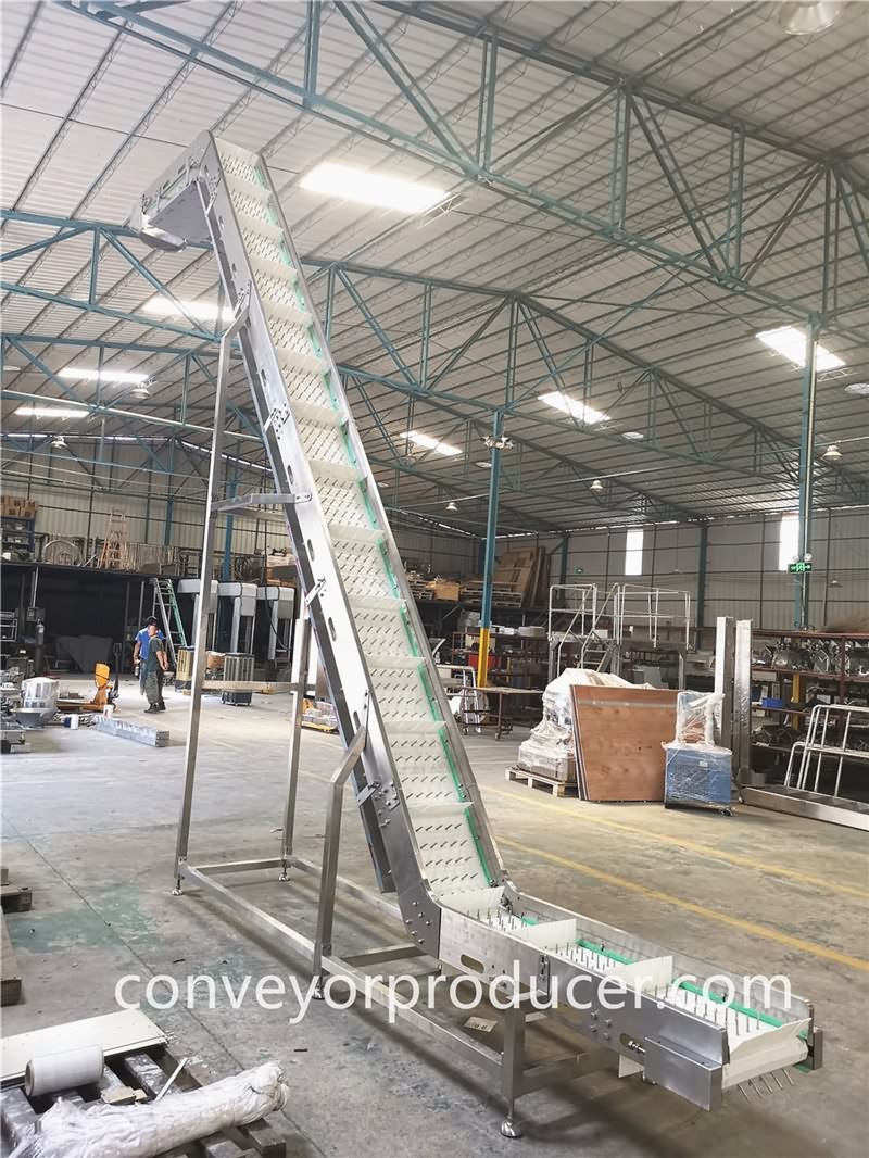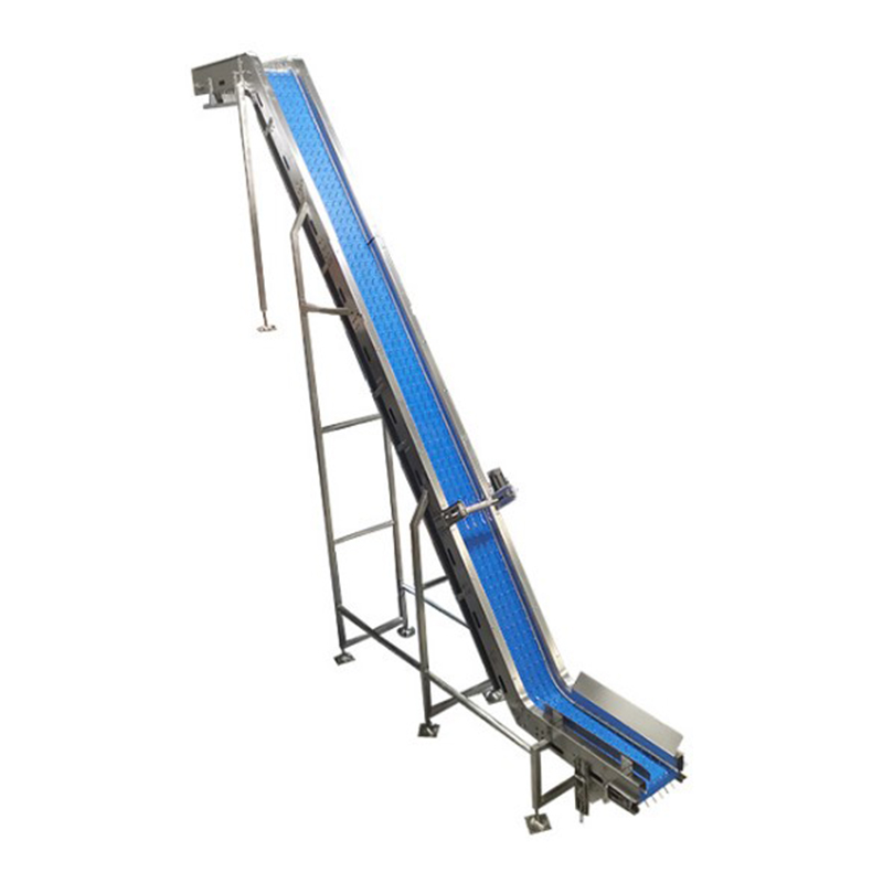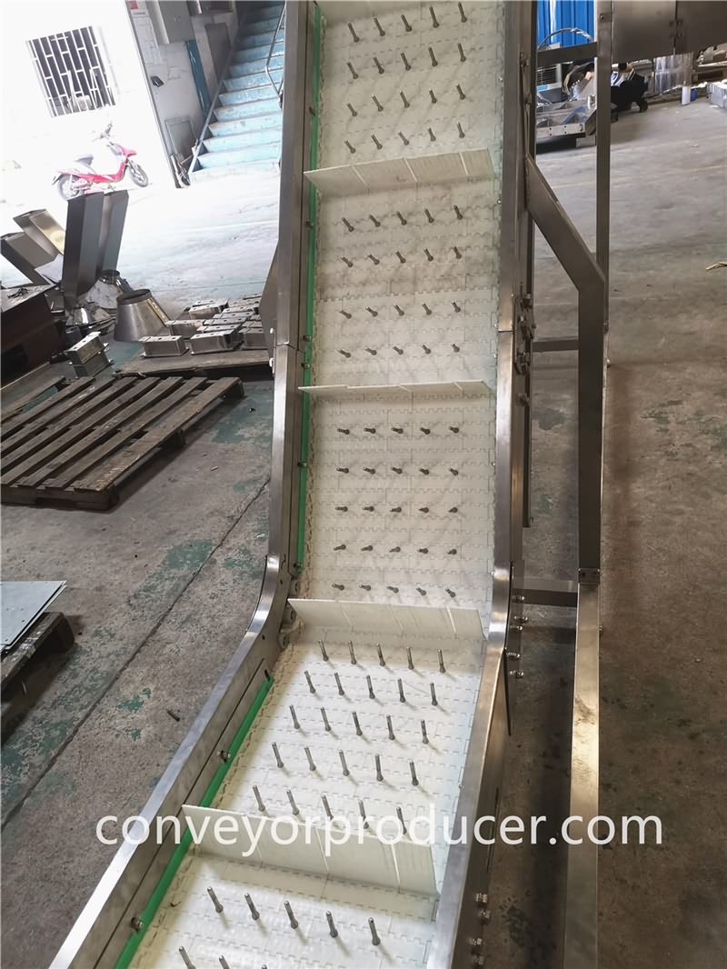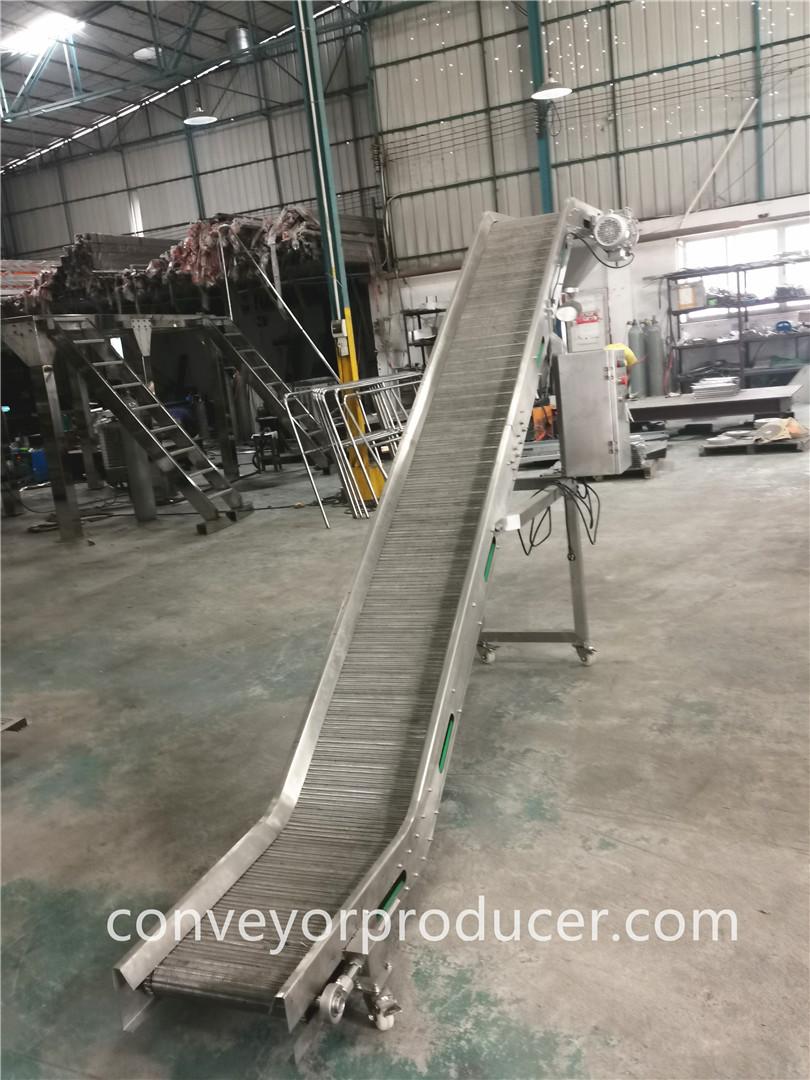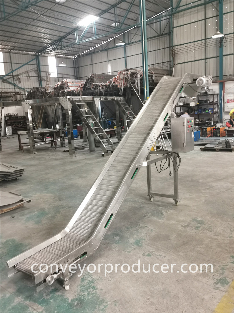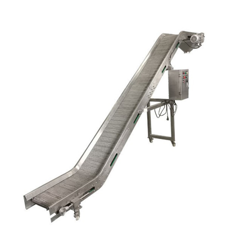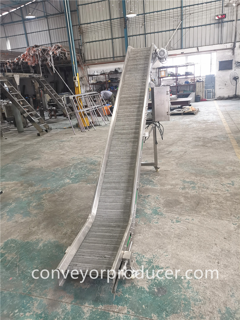 Both sides are made of 304 SS for fixed or movable ribs. The net chain rotates and feeds, and the ribs do not work with the rotation of the net chain. It is mainly suitable for conveying materials with water, oily materials, and alkaline materials that are easily corroded. Fried food, etc. The material is transported obliquely from a low place to the desired location.