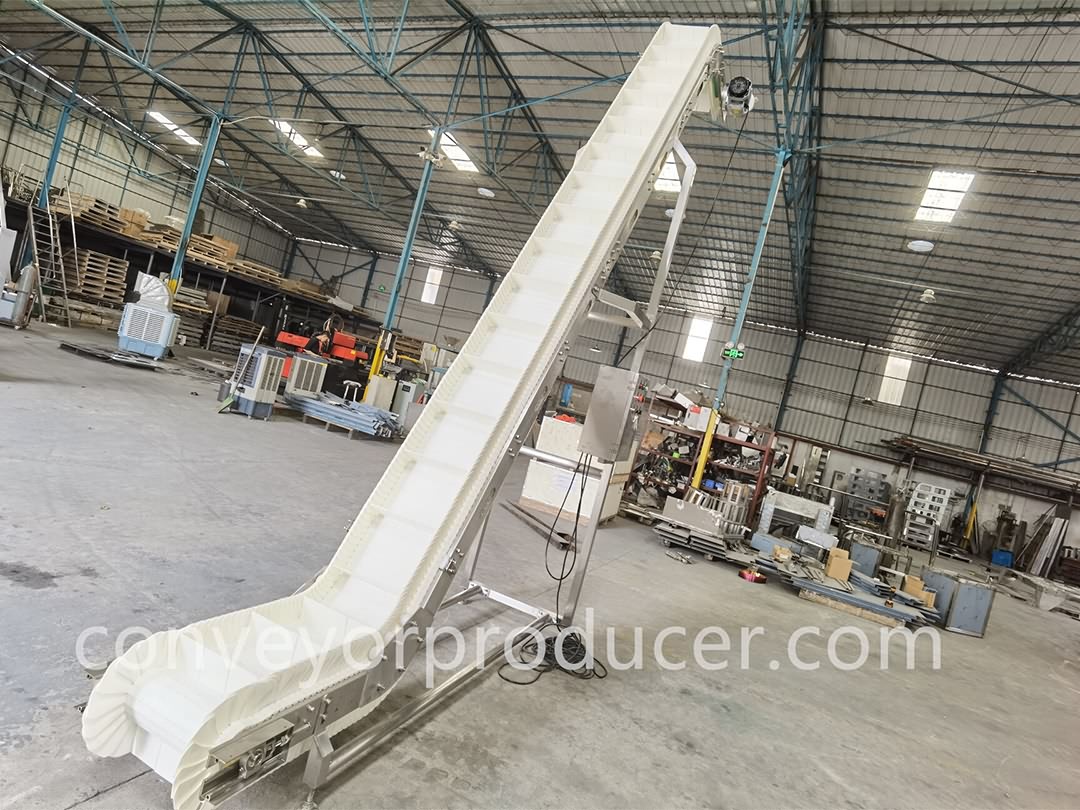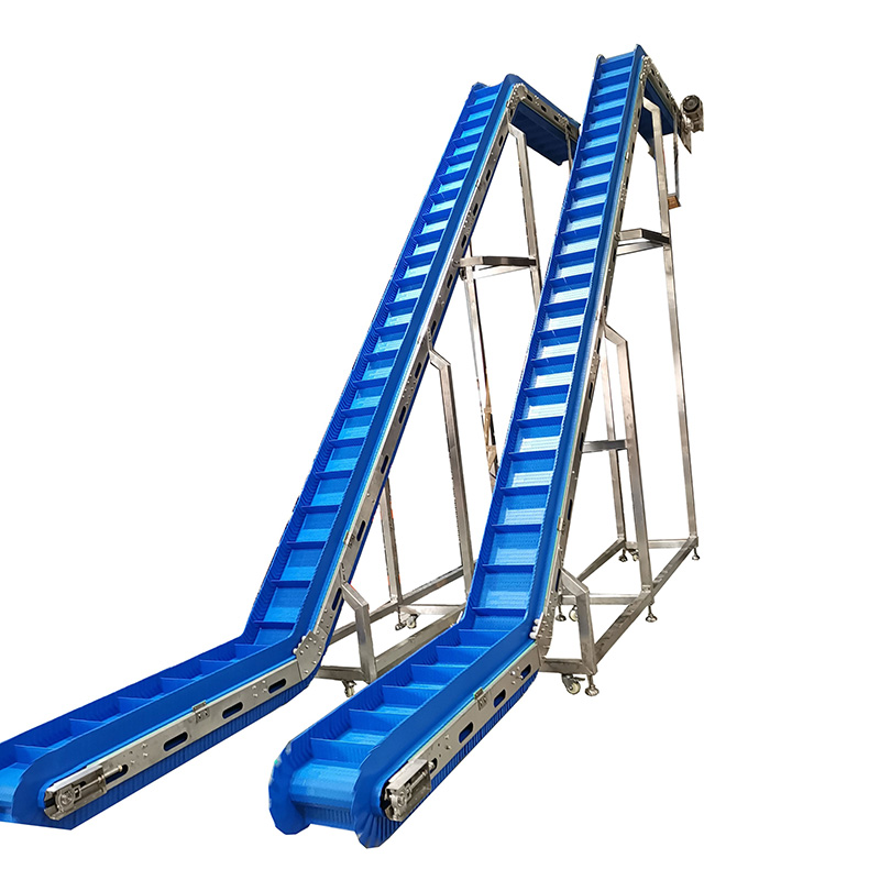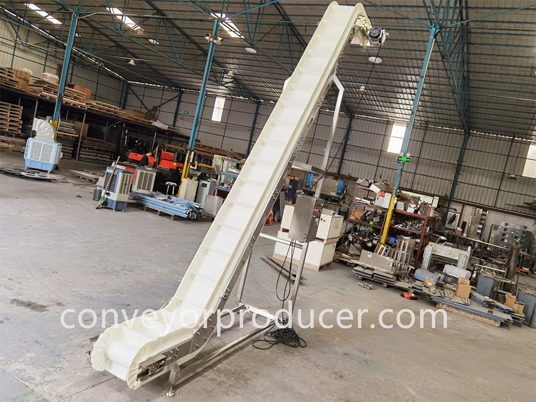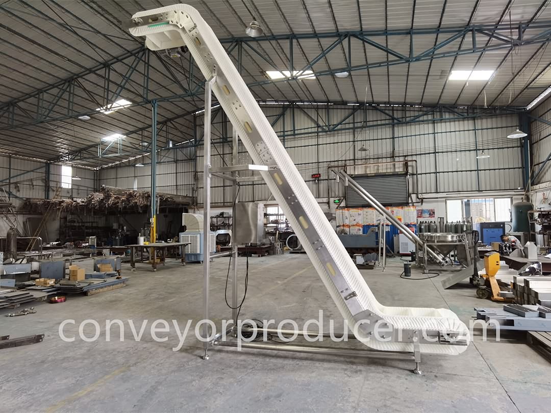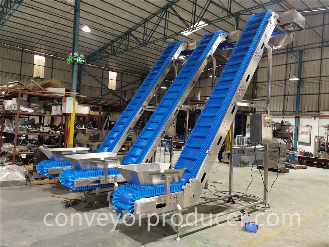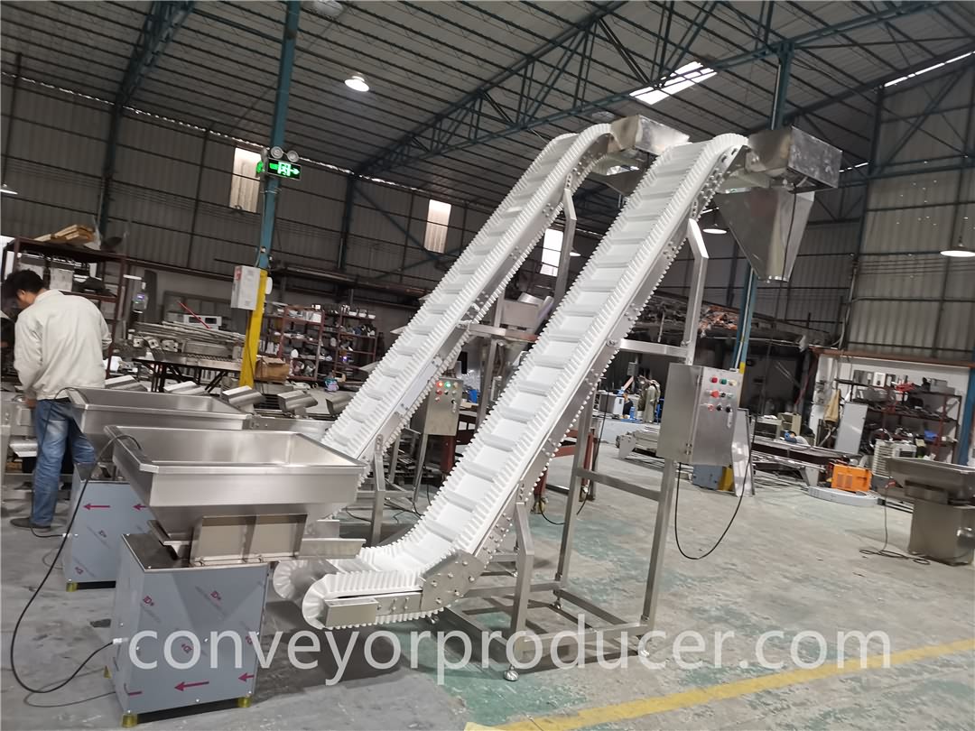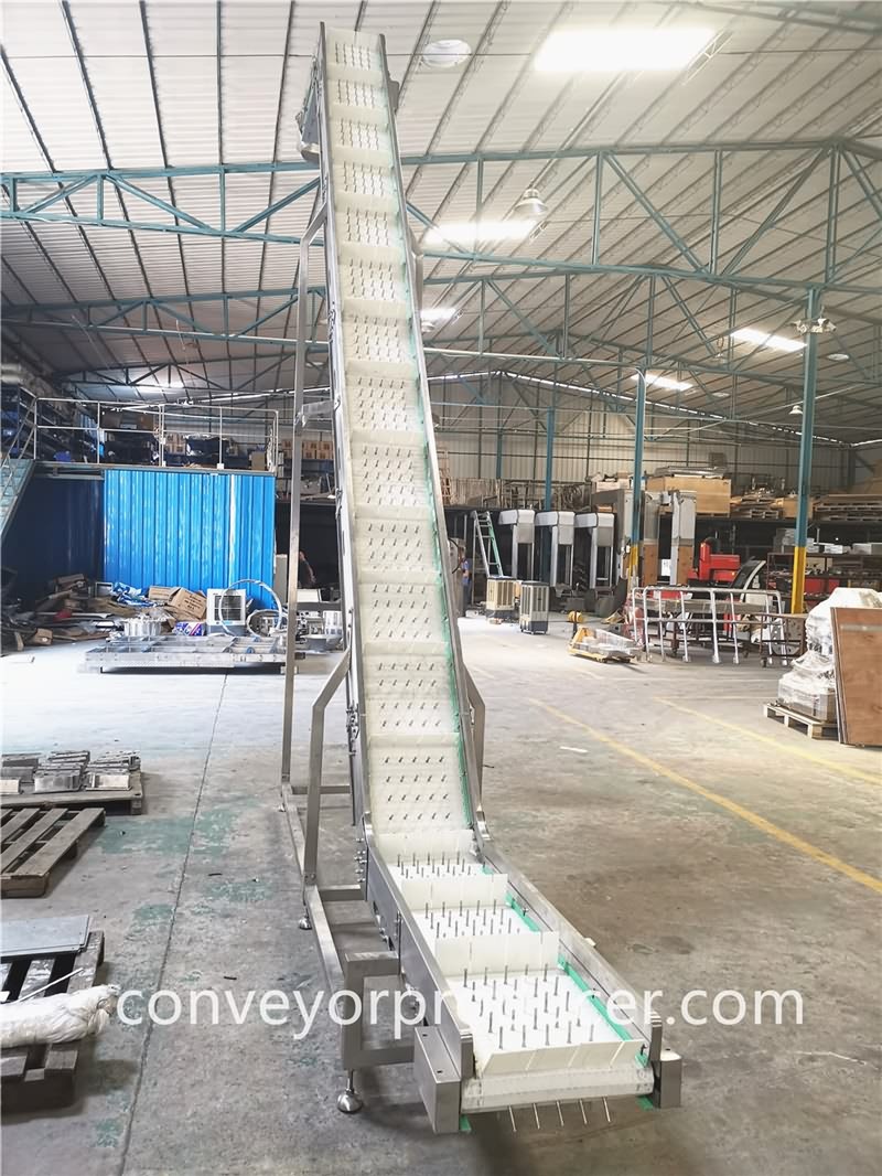 Both sides are made of 304 SS for fixed or movable ribs. The net chain rotates and feeds, and the ribs do not work with the rotation of the net chain. It is mainly suitable for conveying materials with water, oily materials, and alkaline materials that are easily corroded. Fried food, etc. The material is transported obliquely from a low place to the desired location.